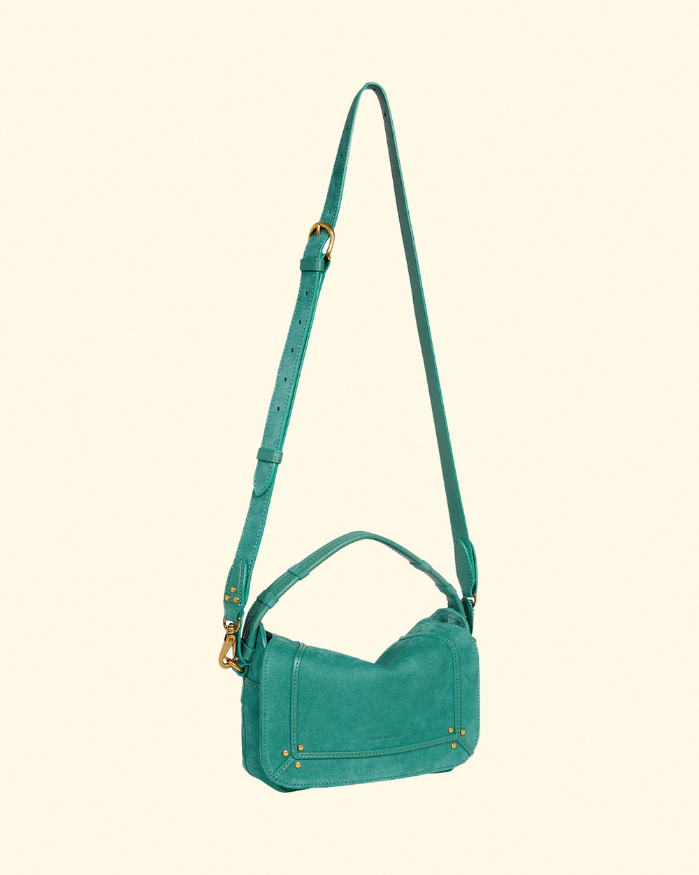 Shoulder bag, can be worn on the shoulder, crossbody, or by hand. It features a quilted leather handle and a long adjustable, removable strap. The closure is a magnetic leather flap adorned with stitched bands. Comes with additional adjustable shoulder strap in cotton trimmed with leather, removable with two snap hooks.