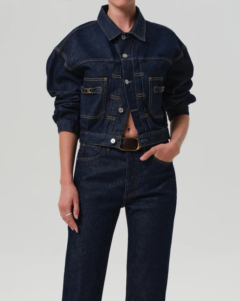 Looks Like: Clean dark rinsed out indigo denim jacket with horsebit detailing