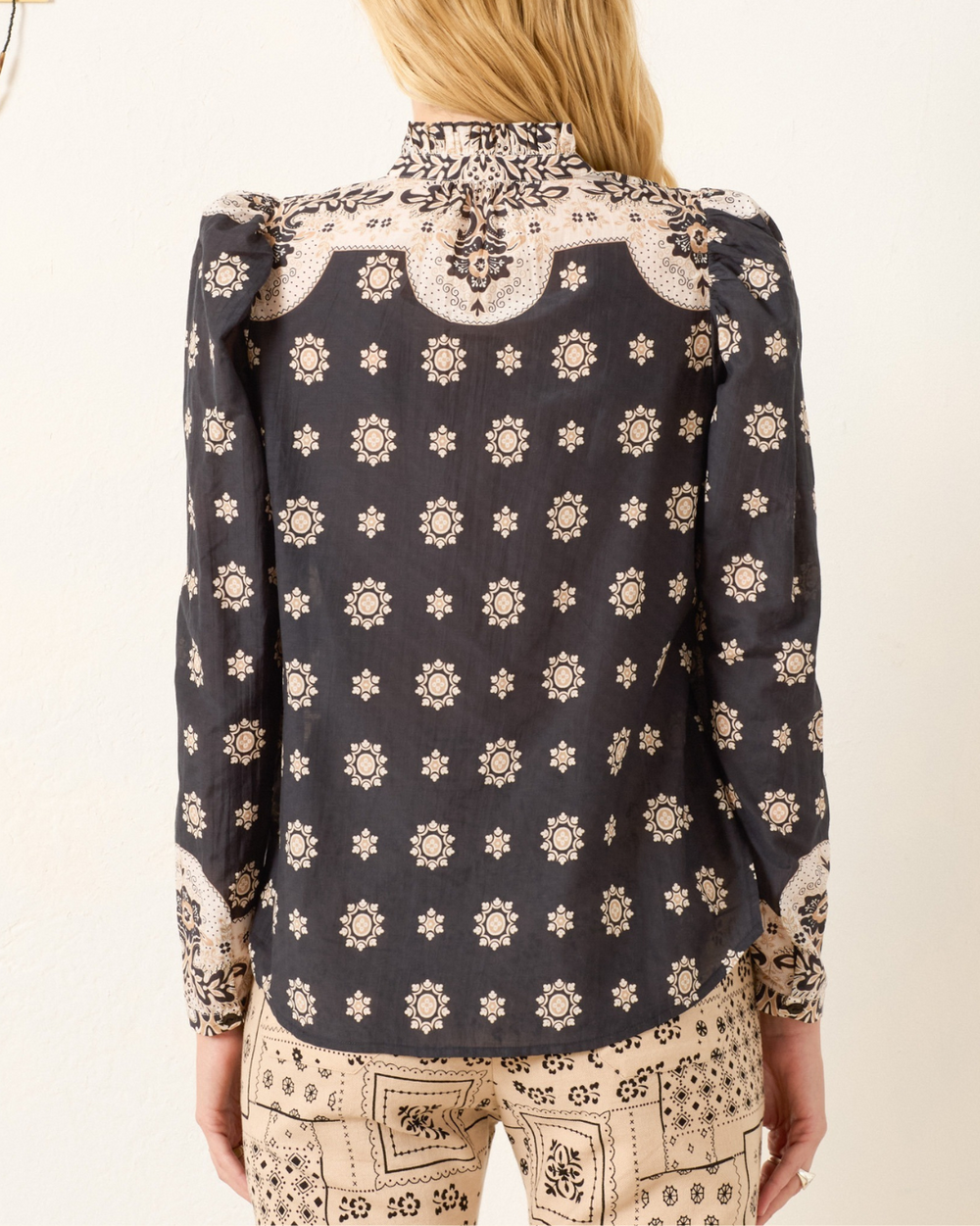 Individually cut by hand, the bandana-print shirt has tapered puff sleeves, a ruffled collar, and a mother-of-pearl button front. The cotton-silk blend shirt is finished with French seams
