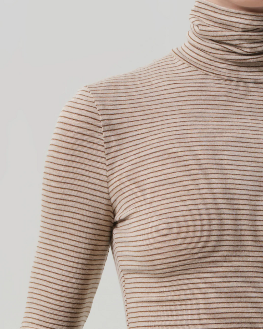 Looks Like: Beige and brown striped long sleeve turtleneck shirt