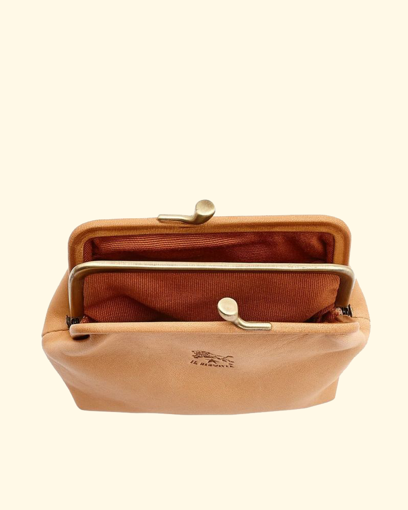 Coin purse with retro snap clasp. Made of vegetable tanned cowhide, in Italy by master craftsmen in Il Bisonte's 30 km supply chain. Brass clasp and components. The cotton-lined interior is divided into two compartments