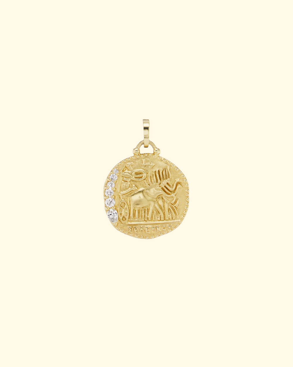 This talisman symbolizes wisdom and strategy and is hand-carved from lustrous 18k gold with pear-shaped and round diamonds set into the surface. This charm comes on a hinge bail that opens up and can be attached to any chain.