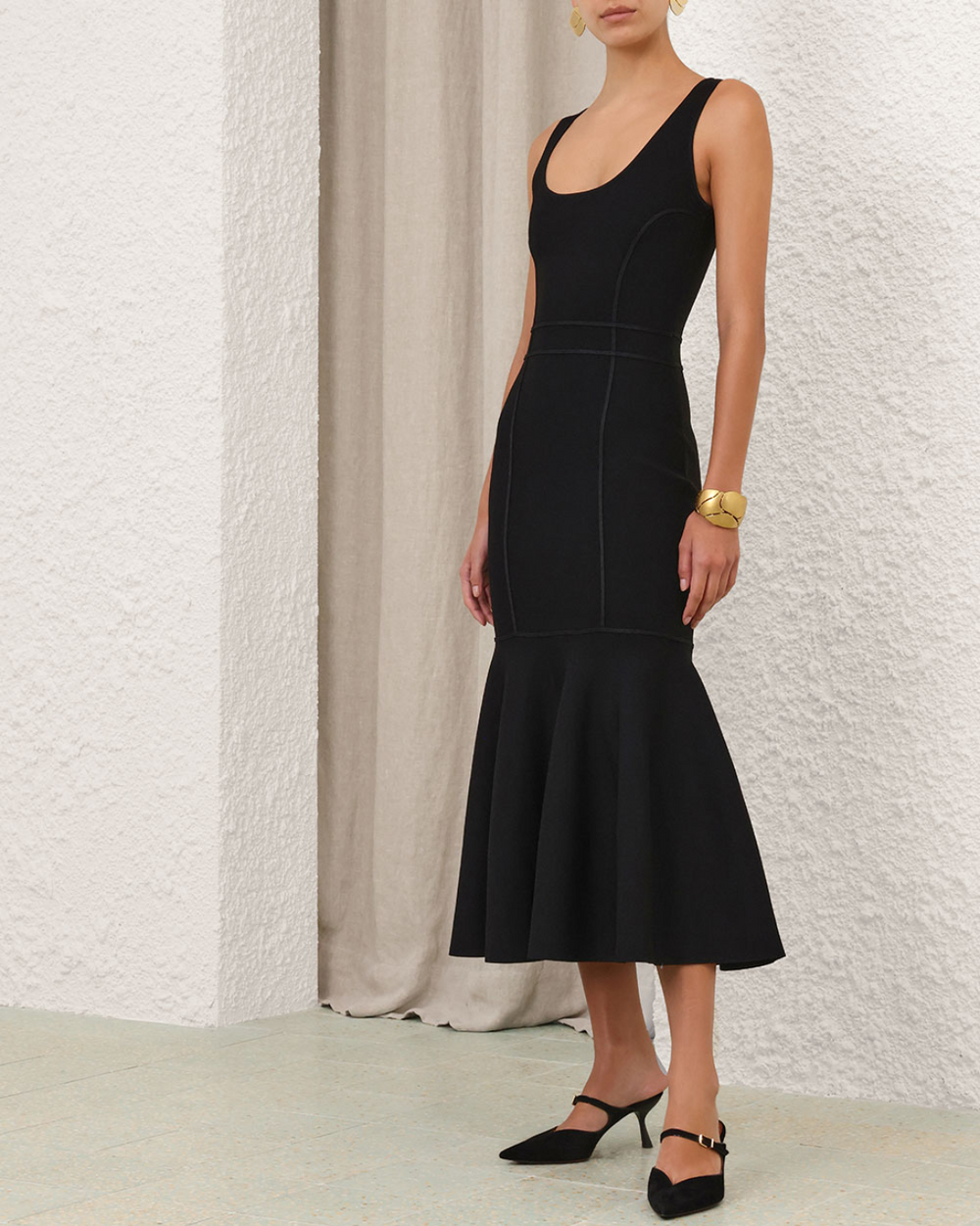 The Hypnotic Sculptural Midi Dress in Black from Zimmermann's Fall 2025 Collection, Hypnotic. A knit midi dress featuring a scoop neckline and flared hem.