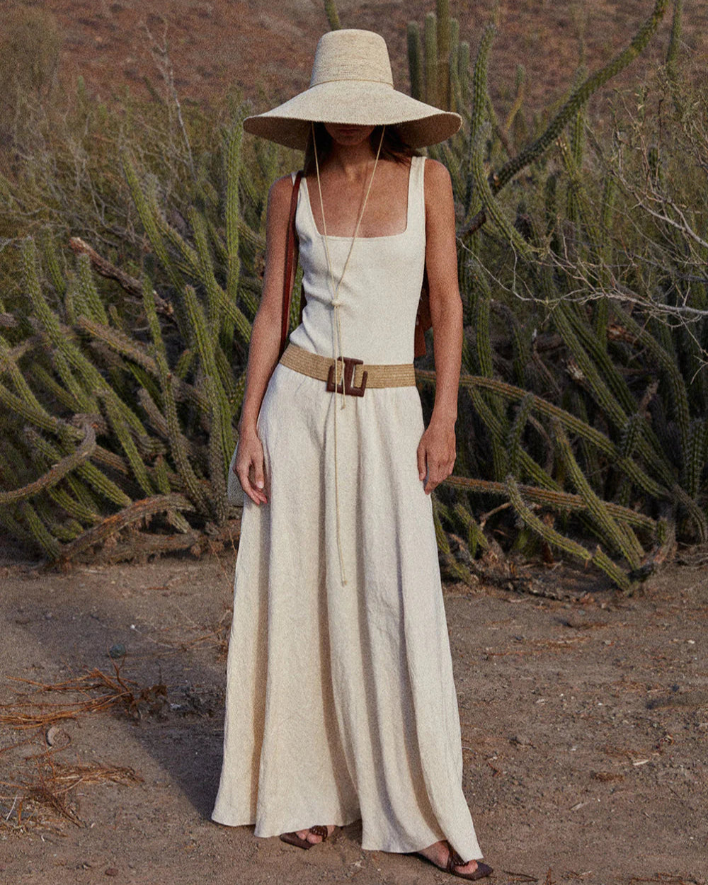 A maxi-length dress crafted from a soft linen-cotton blend with a ribbed texture. Featuring a squared neckline and a flowing silhouette, it’s designed for effortless movement and versatile styling.