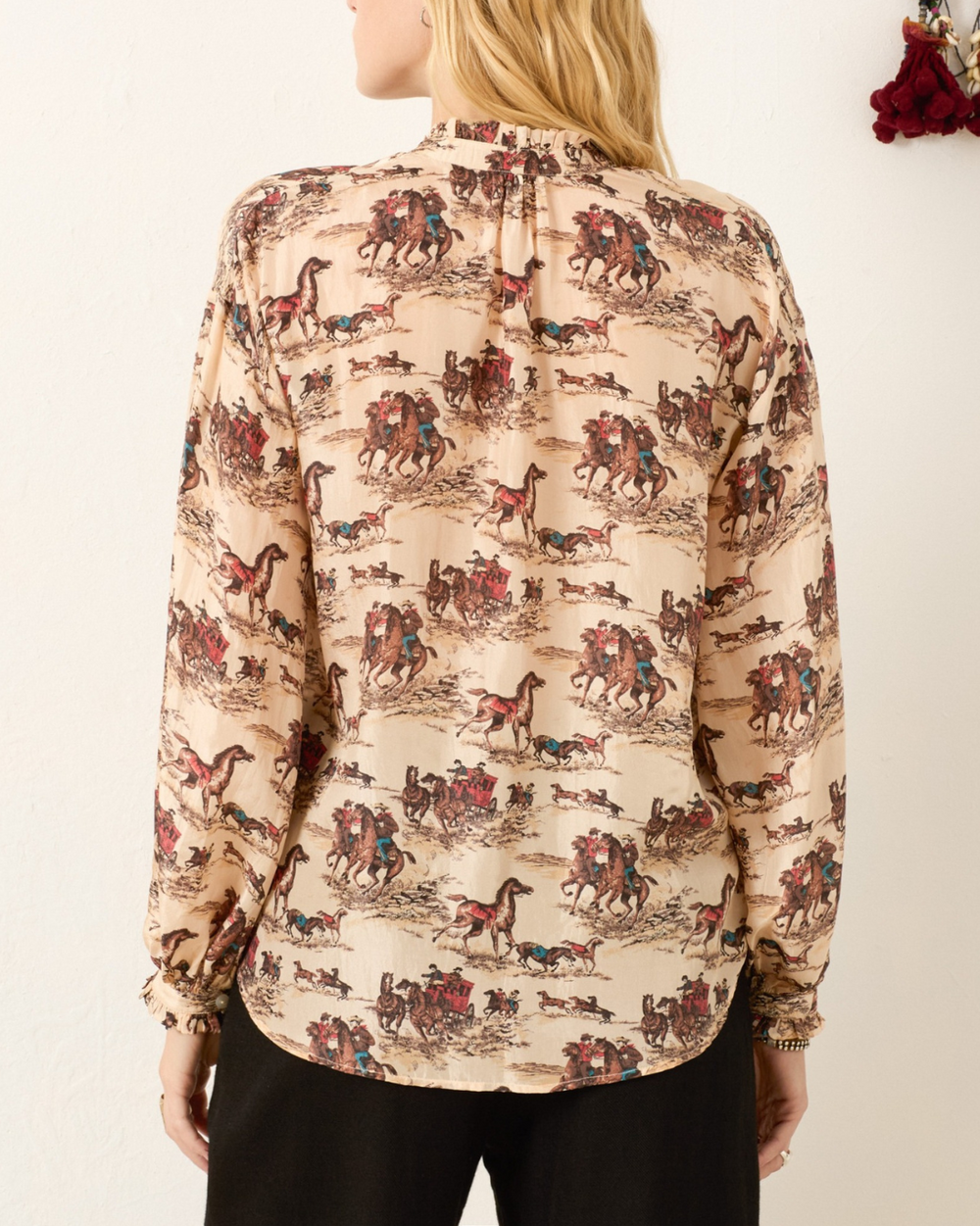 Individually cut by hand, the cotton-silk blend shirt has a ruffled collar and cuffs, a mother-of-pearl button front, and dramatically gathered sleeves. The Western-inspired shirt features a tableau of cowboys in a desert landscape.