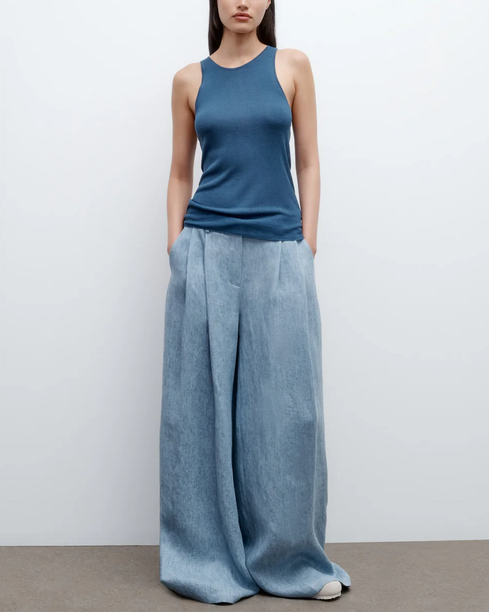 Racerback tank top in ribbed viscose silk. This fabric is lightweight with a silky hand and sheen. The Harbor is a full length, fitted top. Fully fashioned at the arm holes and neckline.