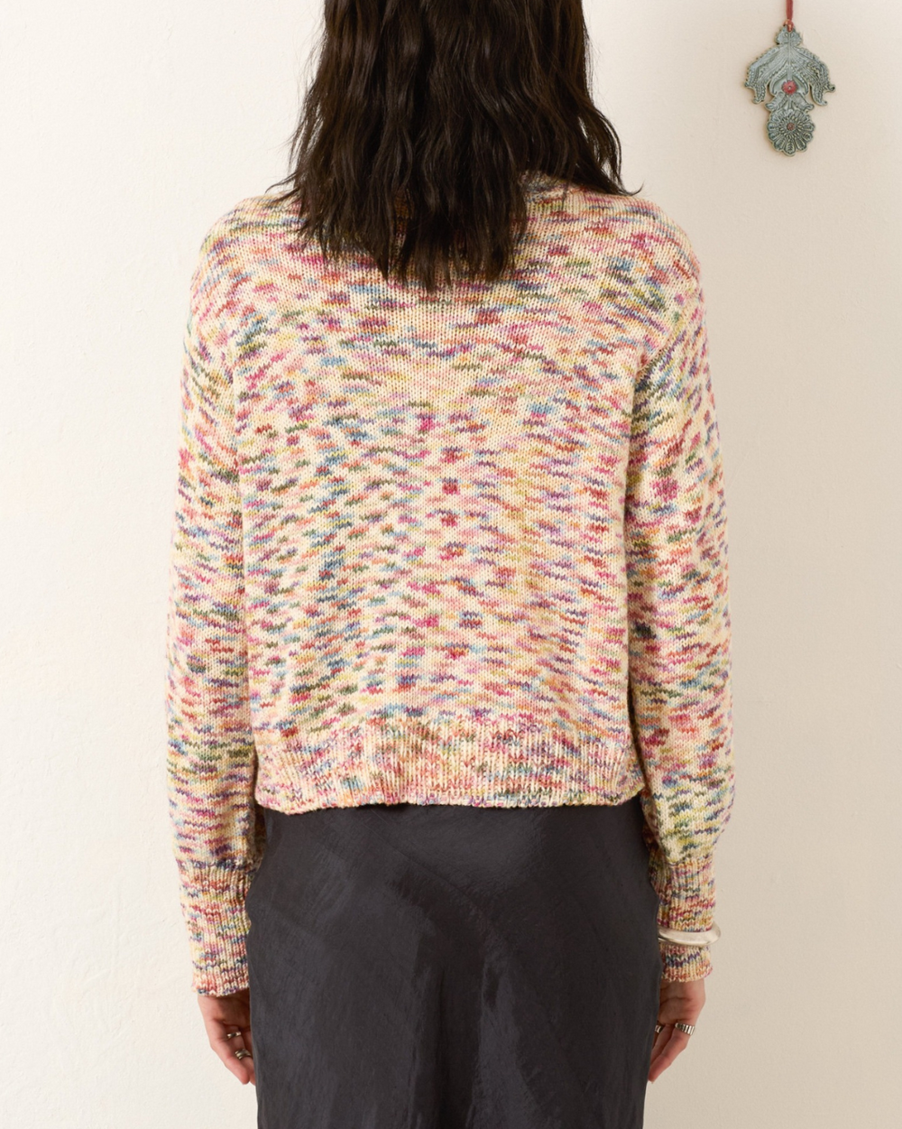 Made from a baby alpaca-blend, the mélange cardigan is knitted from hand-tie-dyed yarn and has a cozy feel.