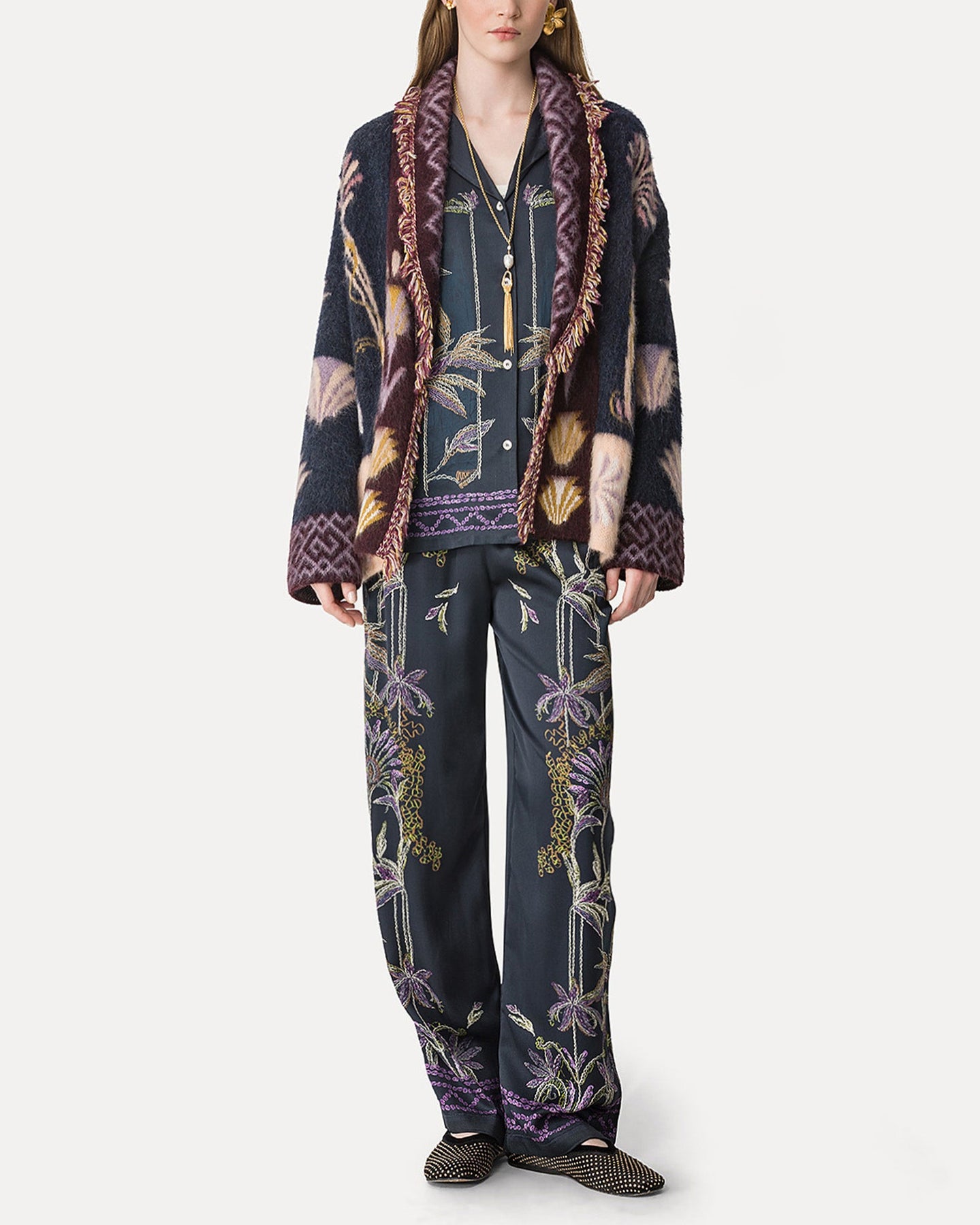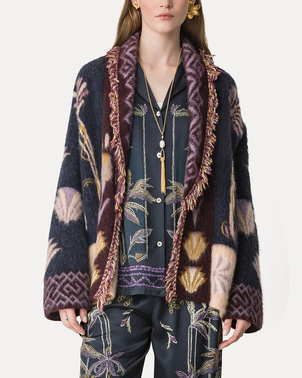 Longline cardigan in baby alpaca wool with a fluffy feel and compact knit featuring floral motifs on the outside and two–tone graphic designs on the inside. the shawl collar has been embellished with wool cabling that releases into swishy fringing. a dropped shoulder and contrasting cuffs are a perfect finishing touch for this cocooning characterful piece.